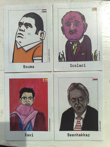 Ook Spotprent Effect ontkomt niet aan de EK-manie die half Europa in zijn greep houdt. In een hippe Bernse bar, licht aangeschoten inmiddels, trof ik onder meer deze plaatjes aan. Duidelijk te herkennen waren de grauwe, doorrookte kop van Leo Beenhakker, het geblokte en robuuste uiterlijk van Wilfred Bouma, de ijdele Spanjaard Xavi en de Portugese bondscoach, driftkikker Scolari (ex-bondscoach eigenlijk, Portugal werd gisteren namelijk door de Duitsers uit het toernooi geknikkerd). Zijn er meer Bern-gangers die dergelijke karikaturen zijn tegengekomen?