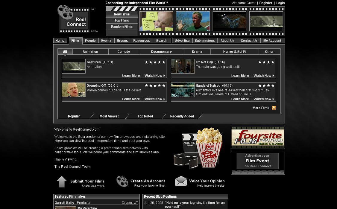 Ik mag mezelf graag een filmliefhebber noemen. Ik heb er inmiddels heel wat gezien en ben er stiekem best een beetje trots op dat ik me nooit heb beperkt tot de blockbusters en sterrenvehikels, maar ook aandacht heb besteed aan juweeltjes als Almost Famous, Pi en Elementairteilchen. In het verlengde hiervan ligt een bovenmatige interesse voor kleinere filmprojecten; onafhankelijke films met een beperkt budget, als dat er al is. ReelConnect, een site voor onafhankelijke filmmakers en filmliefhebbers, biedt creatief talent nu de kans om (korte) films te tonen aan een geïnteresseerd publiek. Het is echter meer dan een podium voor zelfstandige filmmakers; ReelConnect is een virtuele ontmoetingsplaats voor iedereen die zich bezighoudt met films, of dat nu productie of consumptie is.