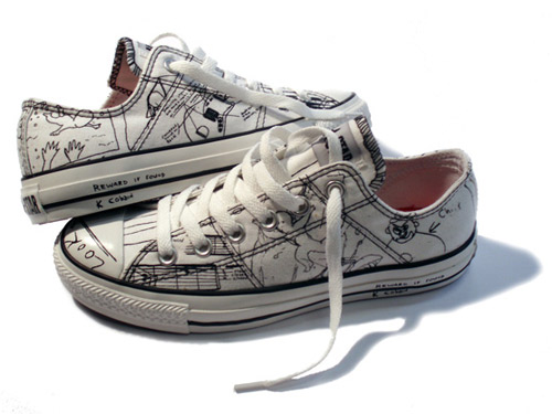 Op een of andere manier ben ik altijd gevoelig geweest voor Converse, vanwege het simpele rock ‘n roll karakter. Toch heb ik het gevoel dat de marketeers achter het merk dit imago tegenwoordig te overduidelijk benadrukken. Vooral als dit soort acties worden bedacht. Maar dit is een persoonlijke mening, de verkoopcijfers zullen waarschijnlijk bewijzen dat deze marketeers hun werk juist goed hebben gedaan. Recentelijk is ook gebleken dat Converse op H&M en Heineken na, het meest populaire merk op Hyves is. Als je er over nadenkt is het wel gek dat juist het boegbeeld van de ‘schijt-aan-mode attitude’, Kurt Cobain met een eigen schoendesign komt. Als meneer Cobain nog geleefd zou hebben was de kans dat hij met een zo’n schoen te koop zou lopen uiteraard volkomen ondenkbaar. Gelukkig worden al zijn zaken goed beheert door een lieftallige weduwe die over al zijn rechten beschikt. Bekijk hieronder enkele designs die komende zomer in de winkels zullen liggen.