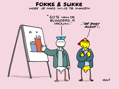 Op internet hoef je niet te zijn wie je daadwerkelijk bent. Puisterige bebrilde puberjochies kunnen zich zonder al te veel moeite voordien als een gespierde adonis en sexueel gefrustreerde oude viezerikken veranderen met een simpele klik in schattige meisjes van 14. Fokke en Sukke hebben dit ook ondervonden en nemen demografische data over bloggers dan ook met de nodige korreltjes zout.