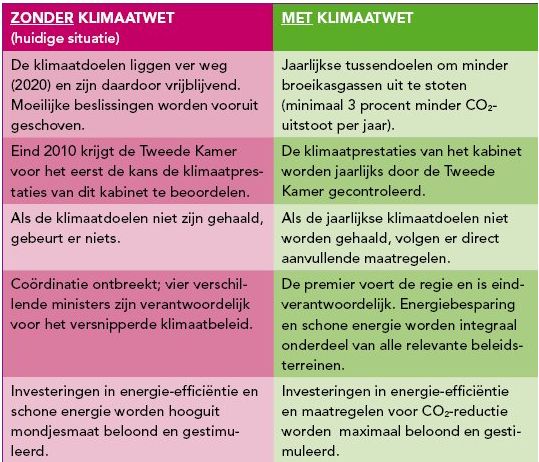 Het klimaat is in rap tempo aan het veranderen. Temperatuurrecords, toename van extreme regenval en ongebruikelijke droogtes zijn daarvan het bewijs. Overheden maken plannen om de uitstoot van broeikasgassen terug te dringen echter zonder veel succes. Ook in Nederland is de CO2 uitstoot sinds 1990 niet afgenomen, maar zelfs toegenomen. Het doel van de regering om de uitstoot van broeikasgassen in 2020 met 30 procent te verminderen is goed, maar te ver weg en te vrijblijvend. Hier moet de Klimaatwet verandering in gaan brengen.