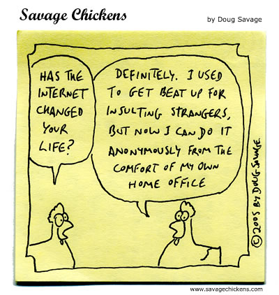 Het probleem van de anonimiteit van internet is al vaker aan de orde gekomen in deze rubriek. Een vlugge blik in de reacties op (ik roep maar wat) GeenStijl maakt de ernst van dit probleem duidelijk. Doug Savage kent als Engelstalige waarschijnlijk gelukkig GeenStijl niet, maar toepasselijk is zijn cartoon wel degelijk. Meer werk van hem is te vinden op Savage Chickens.