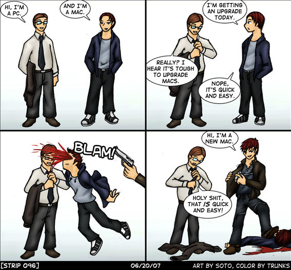 Dit is niet de eerste keer dat de eeuwige strijd tussen Mac- en PC-gebruikers op Spotlight Effect aan bod komt. Evenmin geldt dit voor de parodieën die erop gemaakt zijn: beter goed gejat dan slecht gedaan. Vaak zijn PC-adepten het mikpunt van spot, ditmaal gaat het over het gemak waarmee je een Mac upgrade. Al weet ik niet wie hier nu beter uit is: Mac of PC?