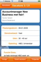 De zoekresultaten zijn wisselvallig, maar dat ligt meer aan het banenaanbod dan aan de app. Het merendeel van de trefwoorden geeft nul vacatures, terwijl er op anderen een grens van 55 lijkt te zitten. In Amsterdam welteverstaan. Nauwkeurig zoeken dan per gemeente is helaas niet mogelijk. Er is bewust voor gekozen de vacatures standaard in een straal van 10 km weer te geven: “Het ontbreken van een keuze voor de straal in de interface sluit beter aan op de iPhone filosofie. Hoe minder hoe beter”, verklaart Hof. Plausibel argument, maar waarom dan een postcode invoeren in plaats van, bijvoorbeeld, een gemeentenaam (met auto-completion!)?