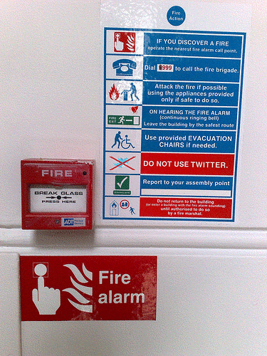 Deze foto vond ik op Guido’s blog. Absoluut een goed initiatief, maar de mededeling had beter iets hoger kunnen staan; het kan al snel te laat zijn. Toch, beter dan niets: “Gebruik geen Twitter in geval van brand”.