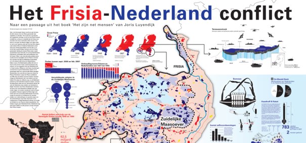 Op pagina 141 vergelijkt Luyendijk het Israël-Palestina conflict met een hypothetisch Frisia – Nederland conflict. Voor Ruiter Janssen was dat inspiratie om een infographic te maken over hoe zo een conflict er mogelijk uit zou zien. Omdat Israël ongeveer even groot is als Nederland, ‘was de vergelijking snel gemaakt’, aldus Janssen. Hij vertelt aan Wereldjournalisten.nl dat hij drie maanden bezig is geweest met de infographic omdat het vooral moeilijk was om de data te vinden. ‘Ik trek geen partij. Het zijn feiten, maar vanuit de Palestijnse invalshoek. In deze weergave is bijvoorbeeld de angst die diezelfde Kassam-raketten bij miljoenen Israëlische mensen teweegbrengen niet meegenomen.’