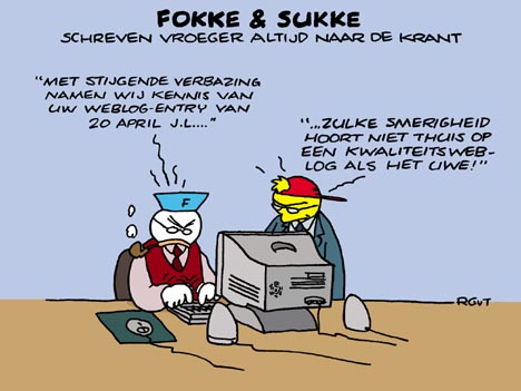 by Jerry HoutmanTijden veranderen. Interactiviteit is wat blogs onderscheidt van, bijvoorbeeld, kranten, en ingezonden brieven hebben plaatsgemaakt voor reacties. Selectie is hierbij niet meer aan de orde, tenslotte kan er oneindig en door iedereen gereageerd worden. Fokke en Sukke maken hier dankbaar gebruik van, al kun je het natuurlijk altijd overdrijven.